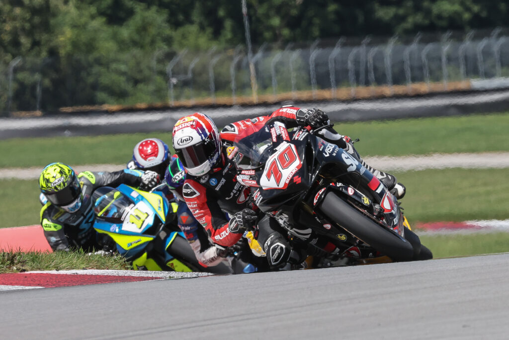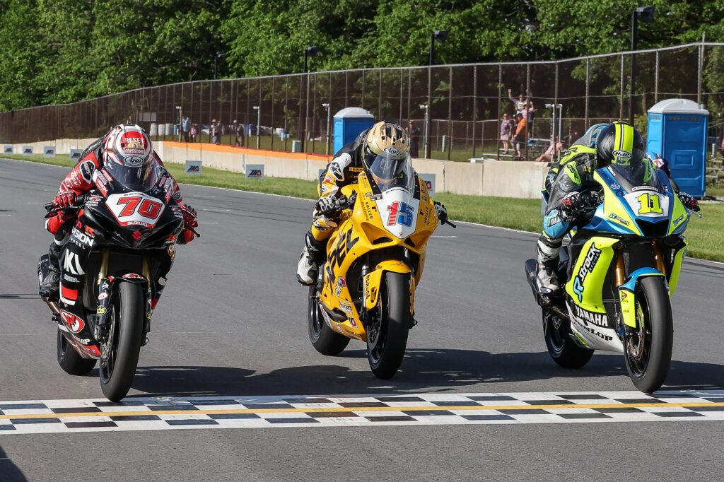 Tyler Scott (70) leading fellow Vision Wheel M4 ECSTAR Suzuki riders Teagg Hobbs (79) and Richie Escalante (54) at the 100th running of the Loudon Classic.